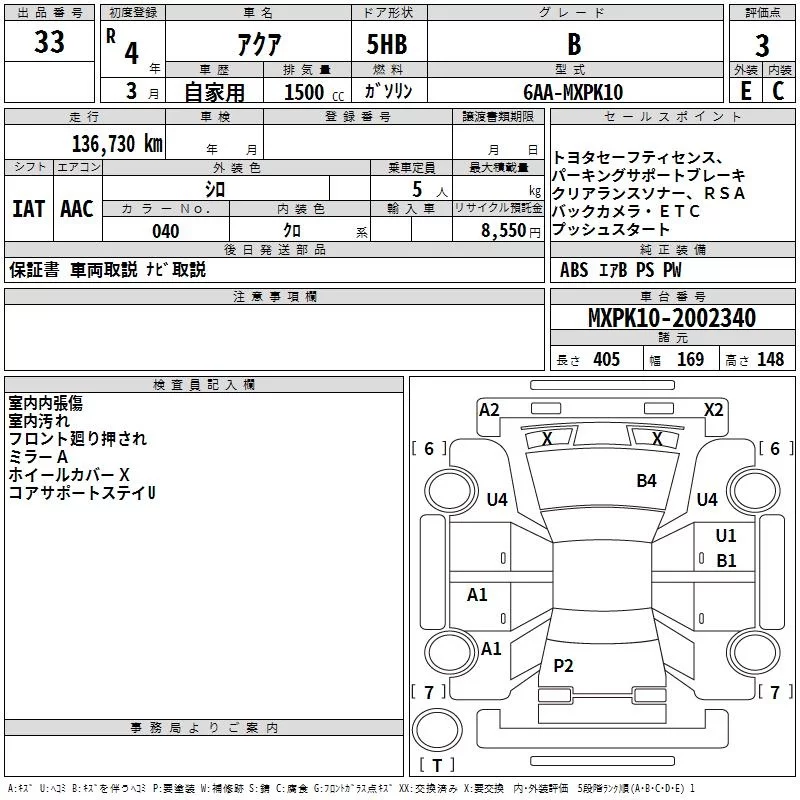 Toyota AQUA с аукциона Японии TAA Kinki лот № 33