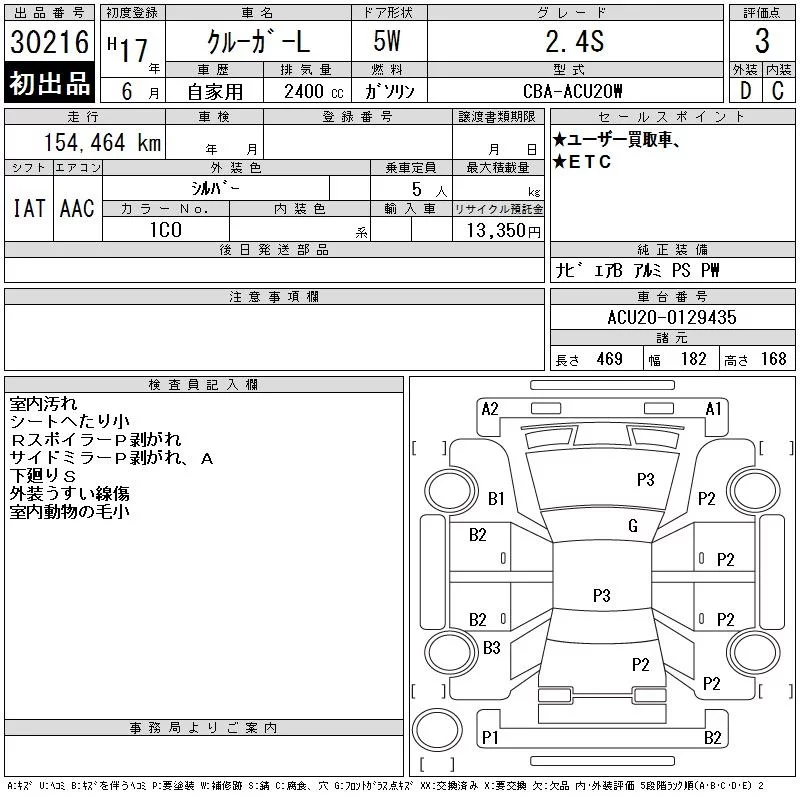Toyota KLUGER с аукциона Японии CAA Tokyo лот № 30216
