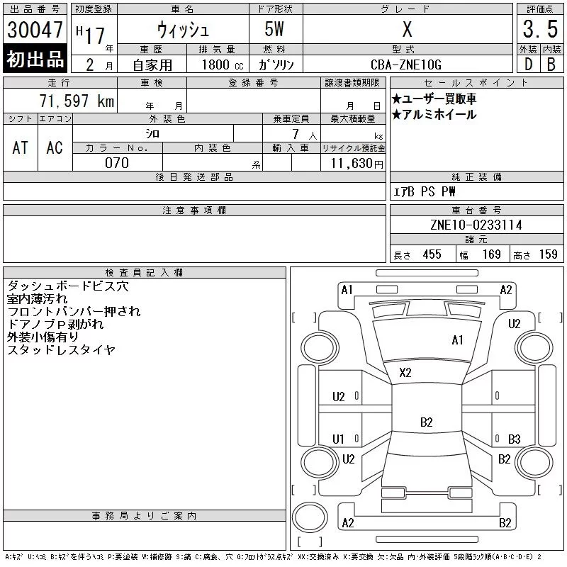 Toyota WISH с аукциона Японии CAA Tokyo лот № 30047