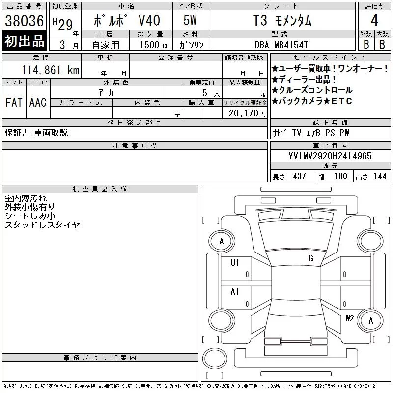 Volvo V40 с аукциона Японии CAA Tokyo лот № 38036