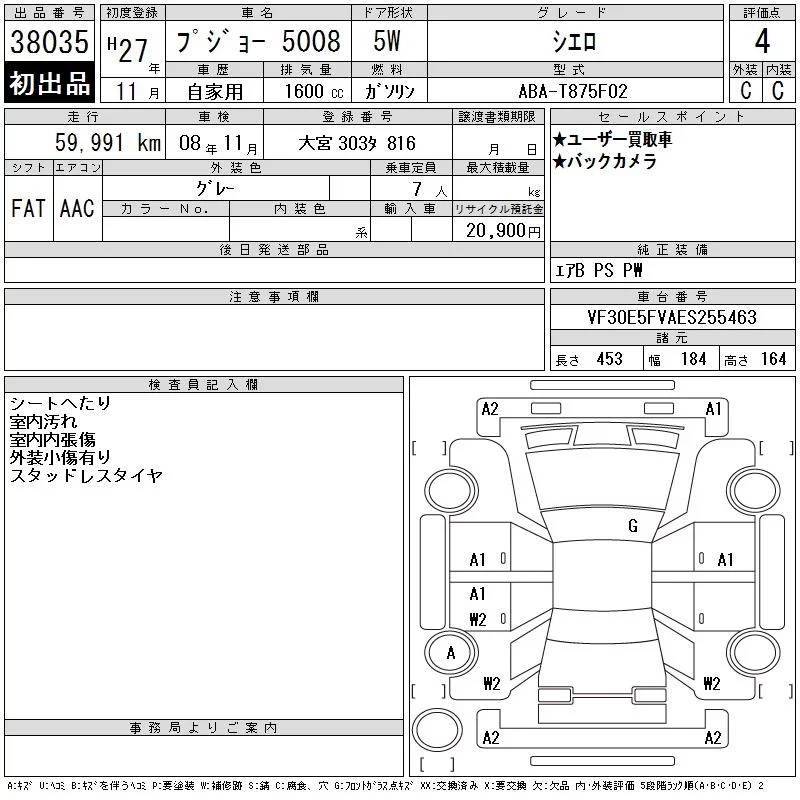 Peugeot 5008 с аукциона Японии CAA Tokyo лот № 38035