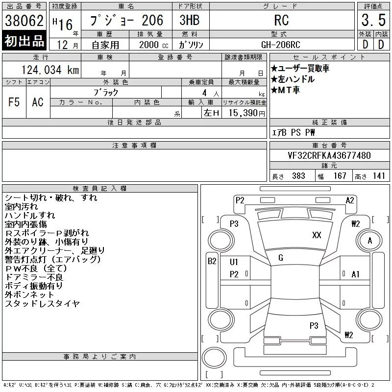 Peugeot 206 с аукциона Японии CAA Tokyo лот № 38062