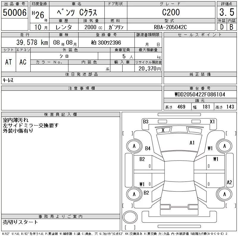 Mercedes-Benz C CLASS с аукциона Японии CAA Tokyo лот № 50006