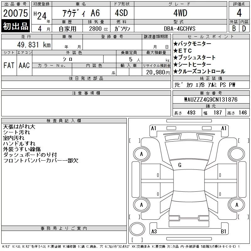 Audi A6 с аукциона Японии CAA Tokyo лот № 20075