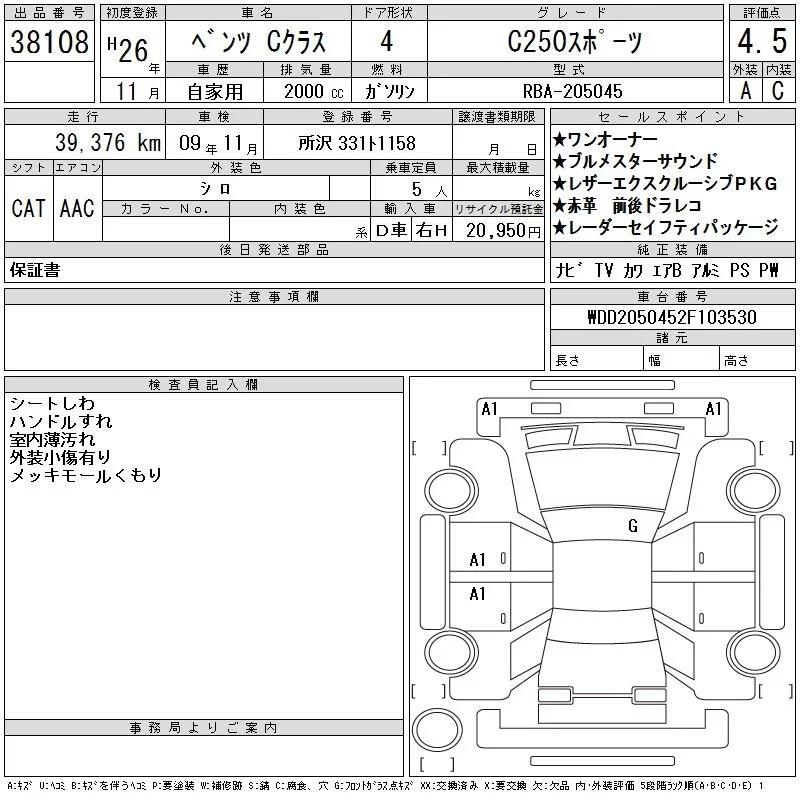 Mercedes-Benz C CLASS с аукциона Японии CAA Tokyo лот № 38108