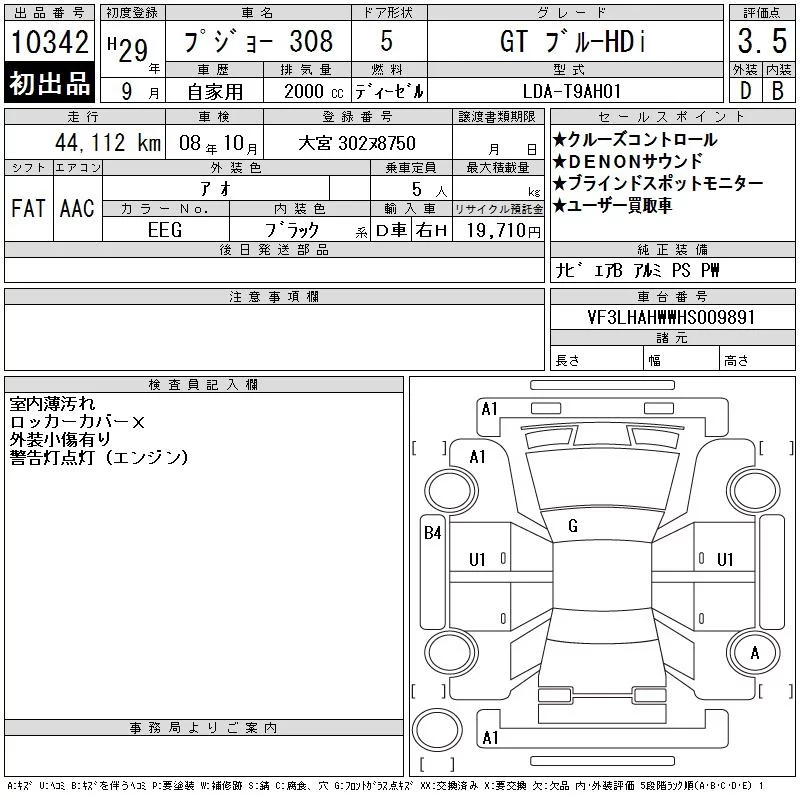 Peugeot 308 с аукциона Японии CAA Tokyo лот № 10342
