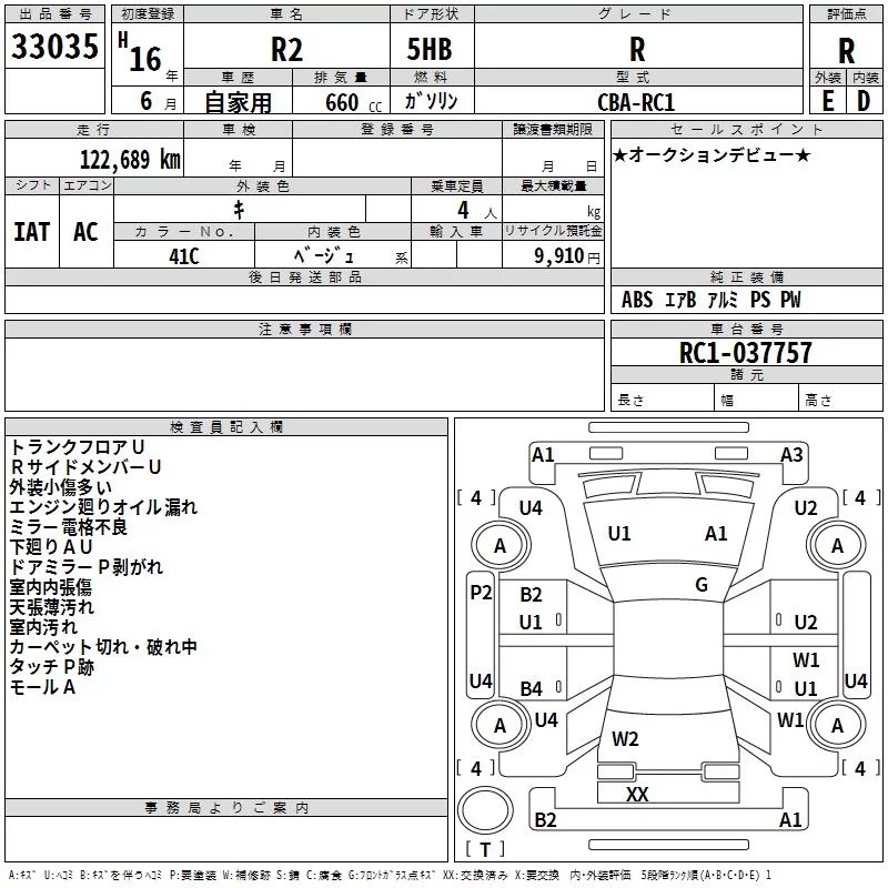 Subaru R2 с аукциона Японии TAA Kinki лот № 33035