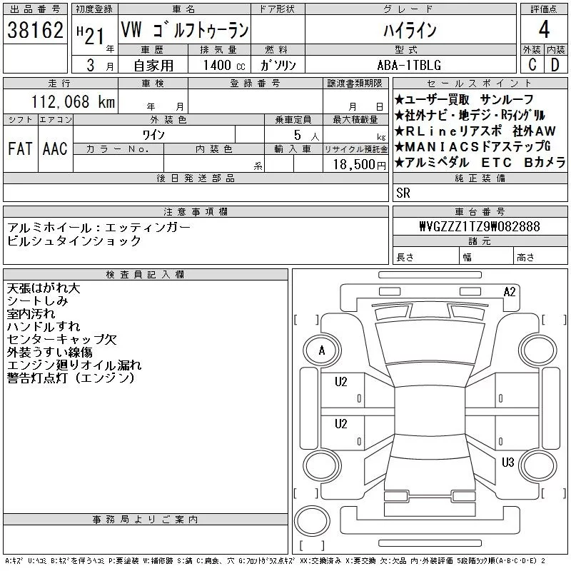 Volkswagen GOLF TOURAN с аукциона Японии CAA Tokyo лот № 38162