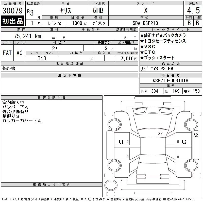 Toyota YARIS с аукциона Японии CAA Gifu лот № 30079