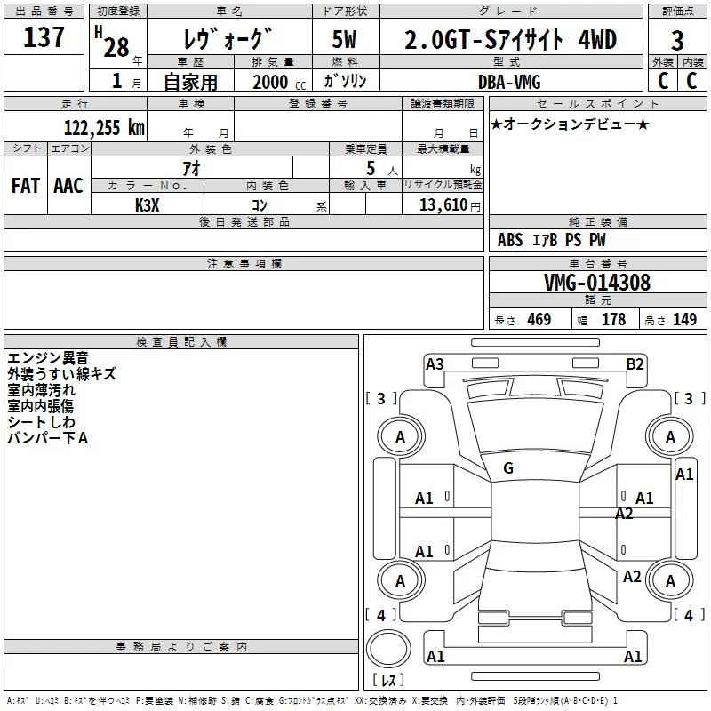 Subaru LEVORG с аукциона Японии TAA Shikoku лот № 137