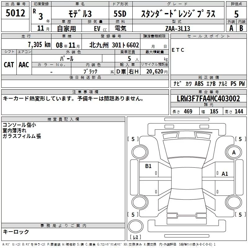 Tesla MODEL3 с аукциона Японии TAA Kyushu лот № 5012