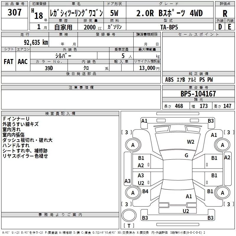 Subaru LEGACY с аукциона Японии TAA Kyushu лот № 307