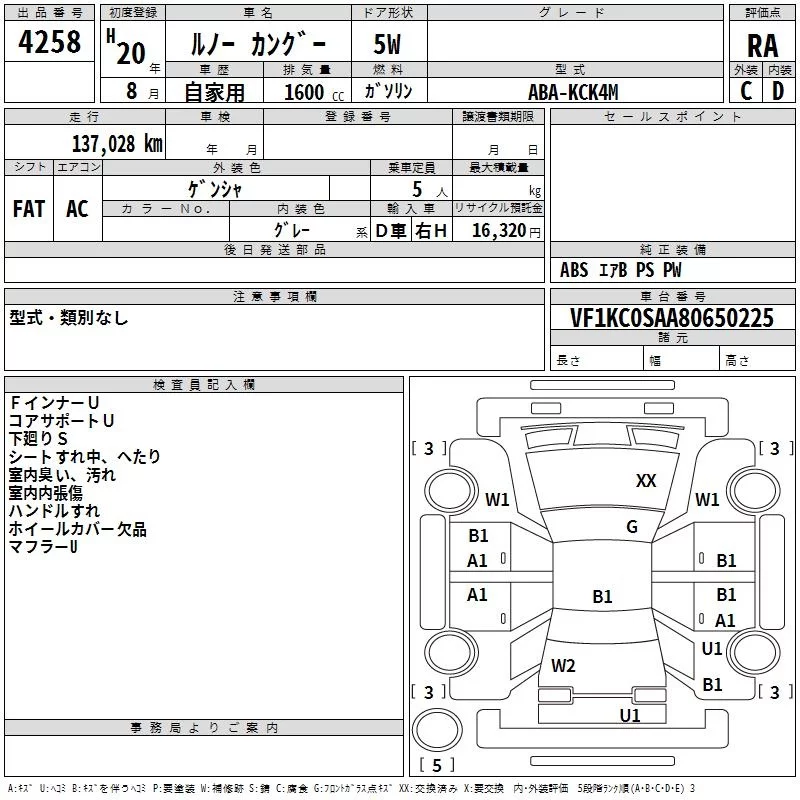 Renault KANGOO с аукциона Японии TAA Kyushu лот № 4258