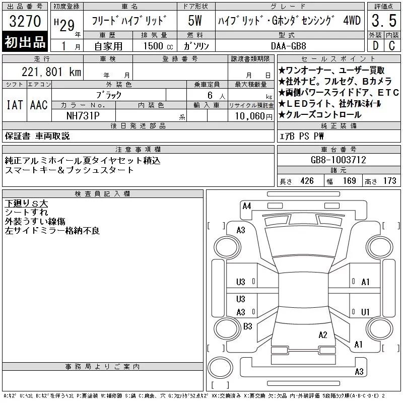 Honda FREED с аукциона Японии CAA Tohoku лот № 3270