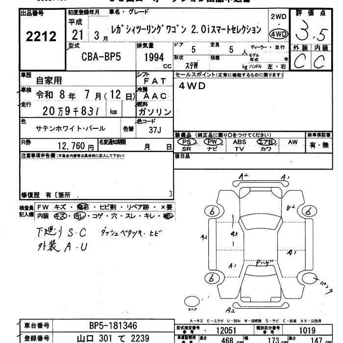 Subaru LEGACY с аукциона Японии JU Yamaguchi лот № 2212