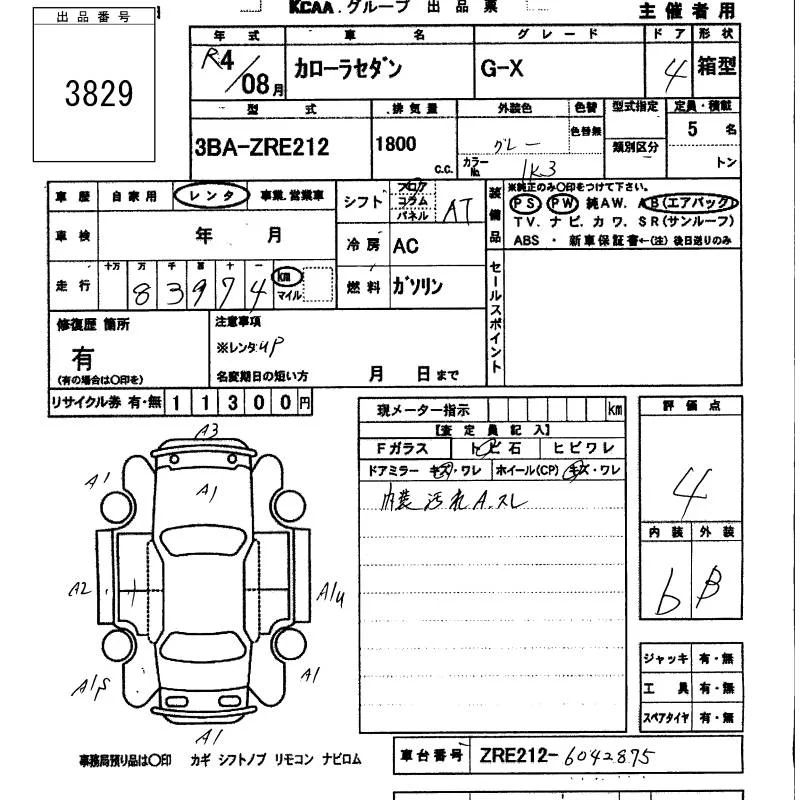 Toyota COROLLA с аукциона Японии KCAA Minami Kyushu лот № 3829