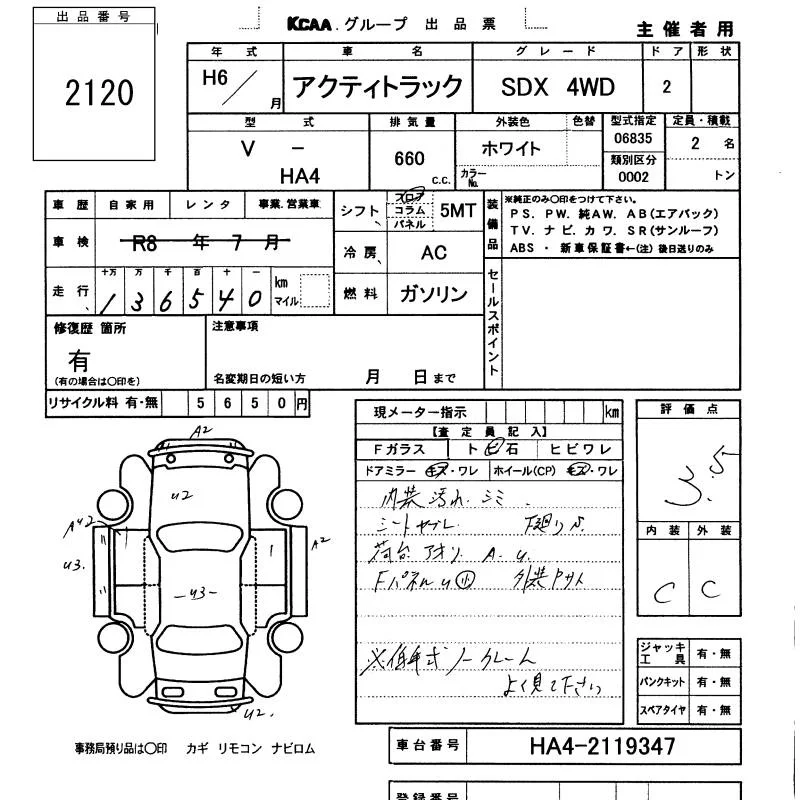 Honda ACTY TRUCK с аукциона Японии KCAA Minami Kyushu лот № 2120