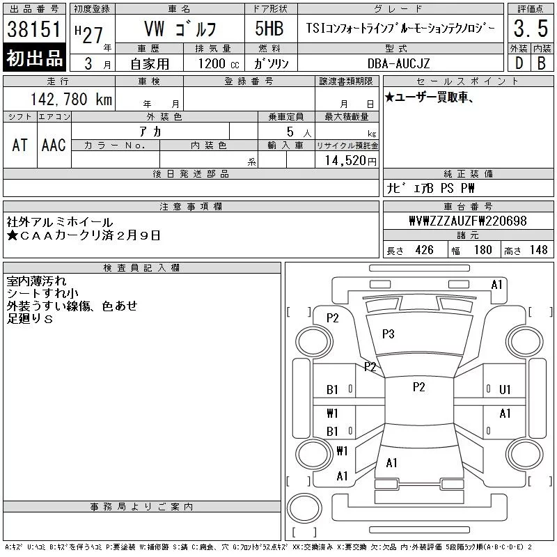 Volkswagen GOLF с аукциона Японии CAA Chubu лот № 38151