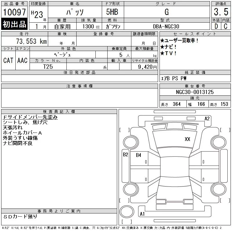 Toyota PASSO с аукциона Японии CAA Chubu лот № 10097
