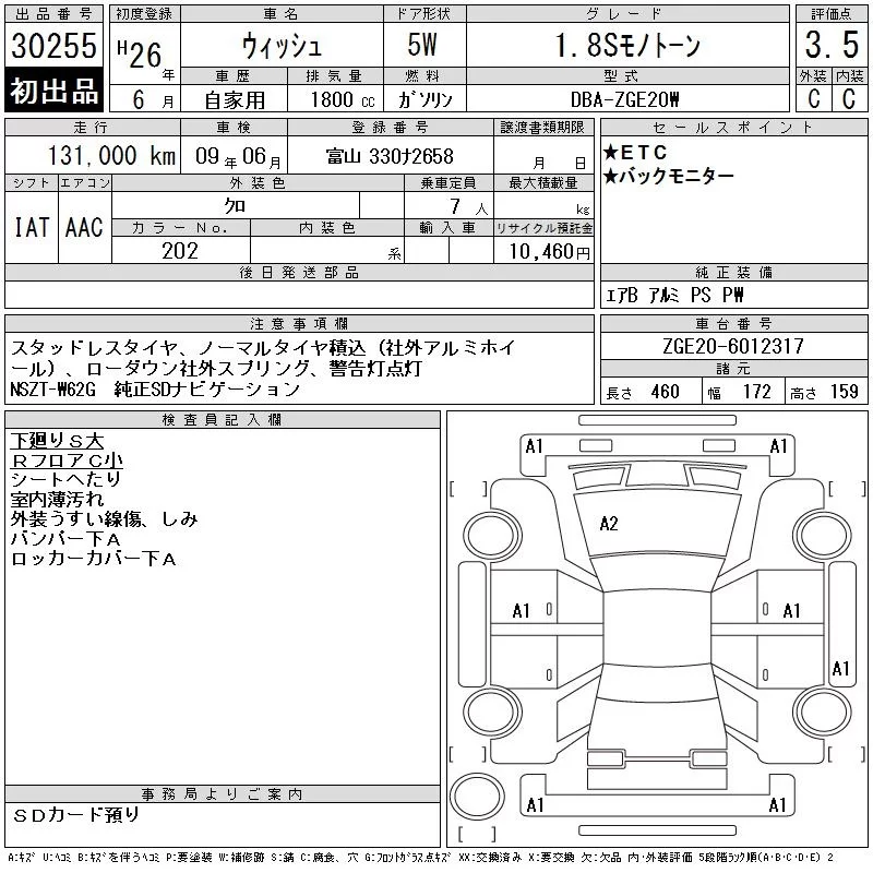 Toyota WISH с аукциона Японии CAA Chubu лот № 30255