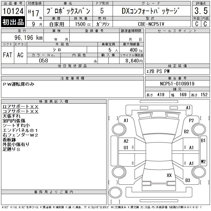 Toyota PROBOX с аукциона Японии CAA Chubu лот № 10124