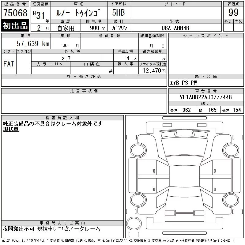 Renault TWINGO с аукциона Японии CAA Chubu лот № 75068