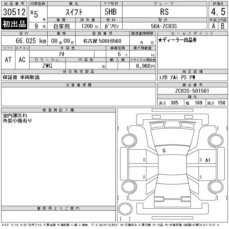 Suzuki SWIFT с аукциона Японии CAA Chubu лот № 30512
