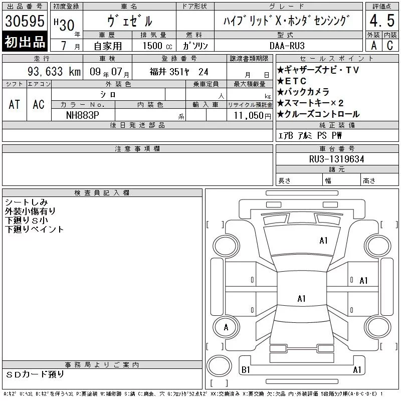 Honda VEZEL с аукциона Японии CAA Chubu лот № 30595