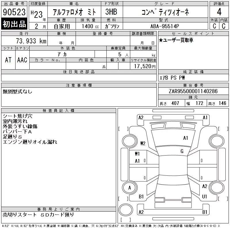 Alfa Romeo MiTo с аукциона Японии CAA Chubu лот № 90523