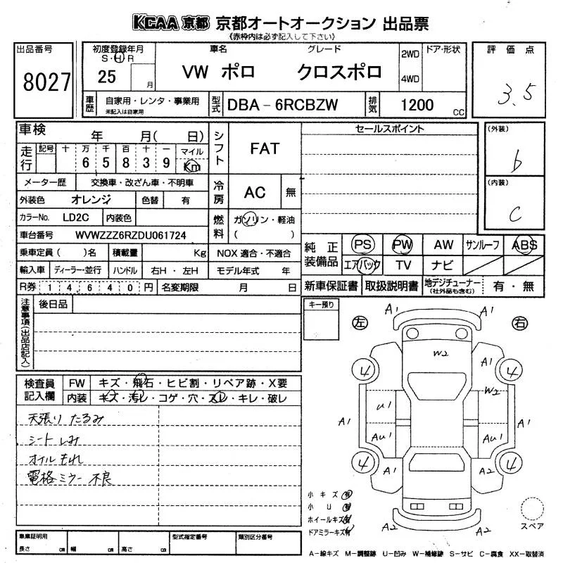 Volkswagen CROSS POLO с аукциона Японии KCAA Kyoto лот № 8027