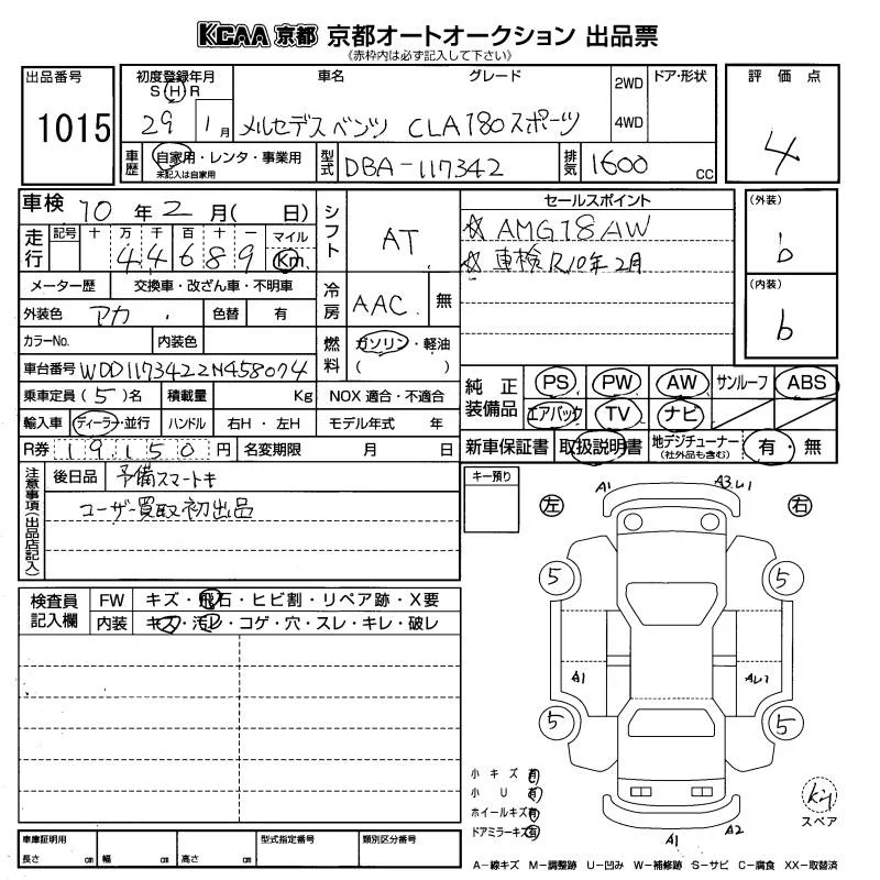 Mercedes-Benz CLA CLASS с аукциона Японии KCAA Kyoto лот № 1015