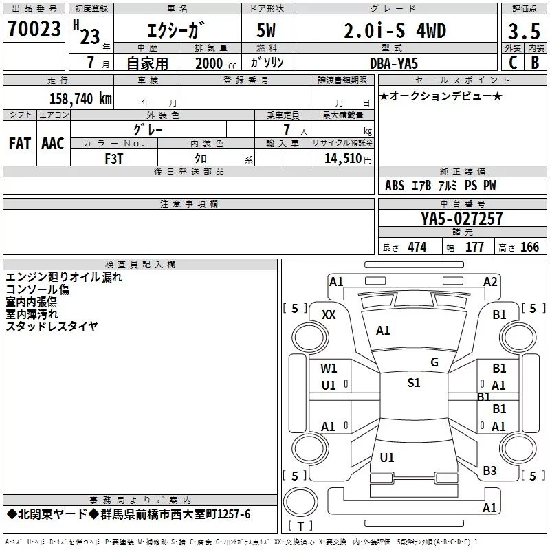 Subaru EXIGA с аукциона Японии TAA Kanto лот № 70023