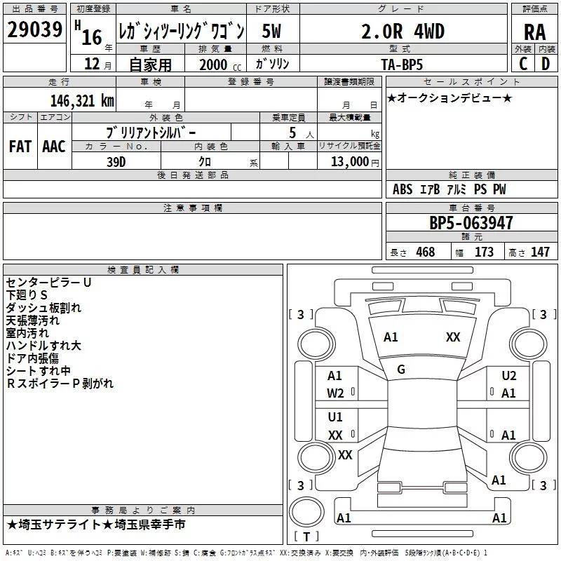 Subaru LEGACY с аукциона Японии TAA Kanto лот № 29039