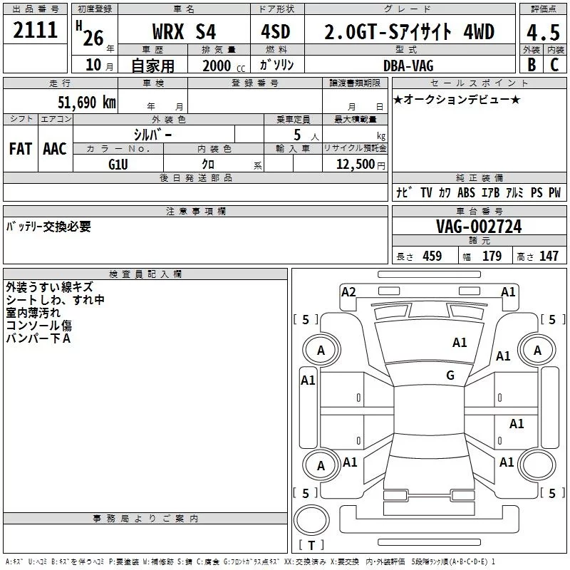 Subaru WRX с аукциона Японии TAA Chubu лот № 2111