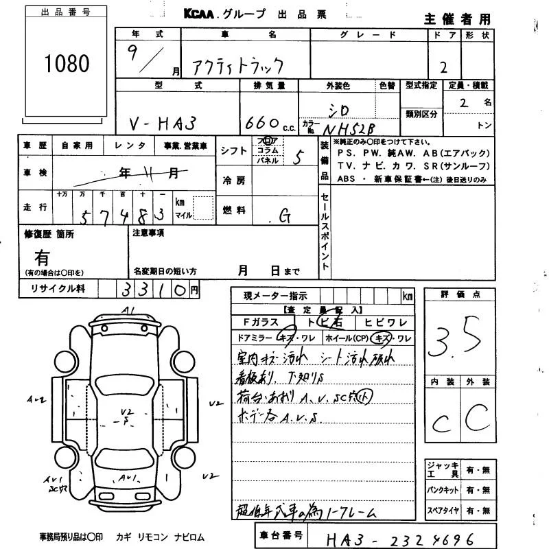Honda ACTY TRUCK с аукциона Японии KCAA Fukuoka лот № 1080