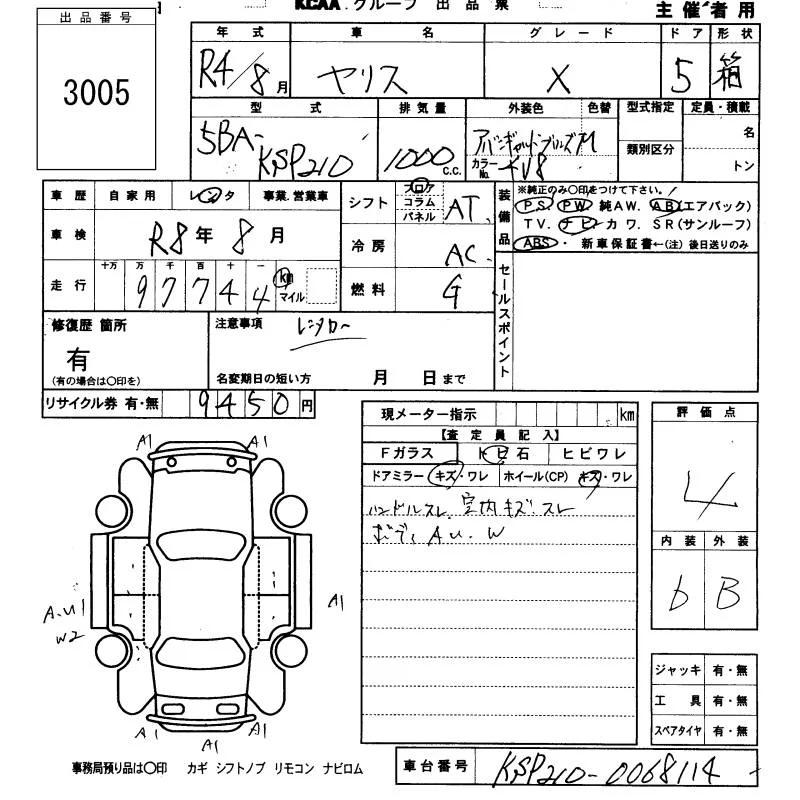 Toyota YARIS с аукциона Японии KCAA Fukuoka лот № 3005