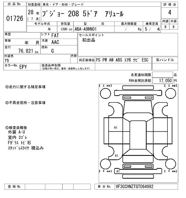 Peugeot 208 с аукциона Японии ARAI Oyama лот № 1726