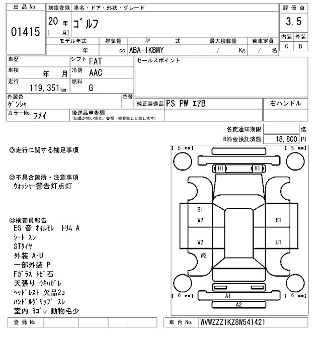 Volkswagen GOLF с аукциона Японии ARAI Oyama лот № 1415