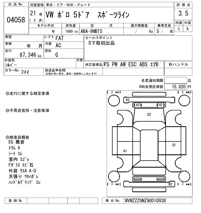Volkswagen POLO с аукциона Японии ARAI Oyama лот № 4058