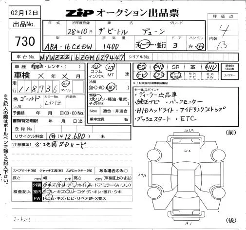 Volkswagen THE BEETLE с аукциона Японии ZIP Osaka лот № 730