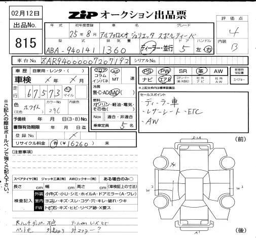 Alfa Romeo Giulietta с аукциона Японии ZIP Osaka лот № 815
