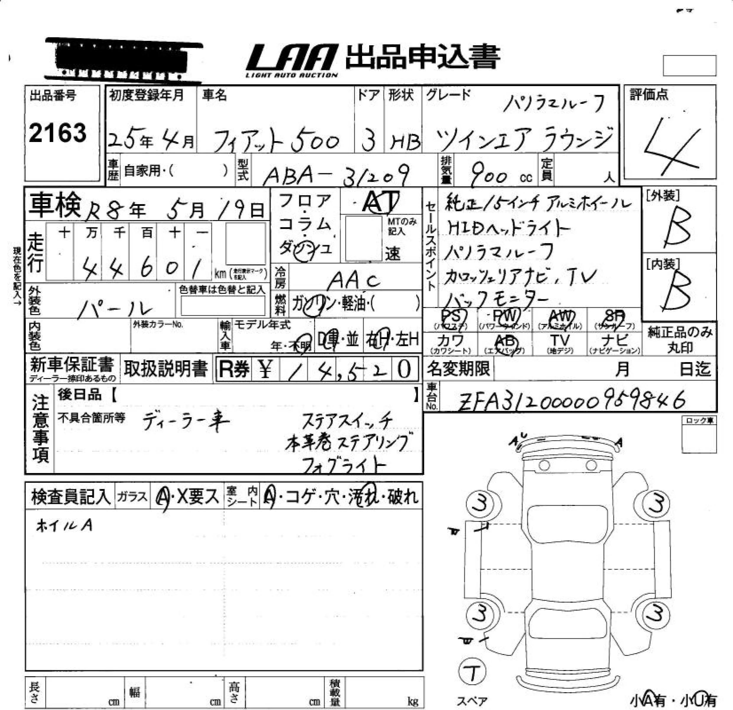 Fiat 500 с аукциона Японии LAA Okayama лот № 2163