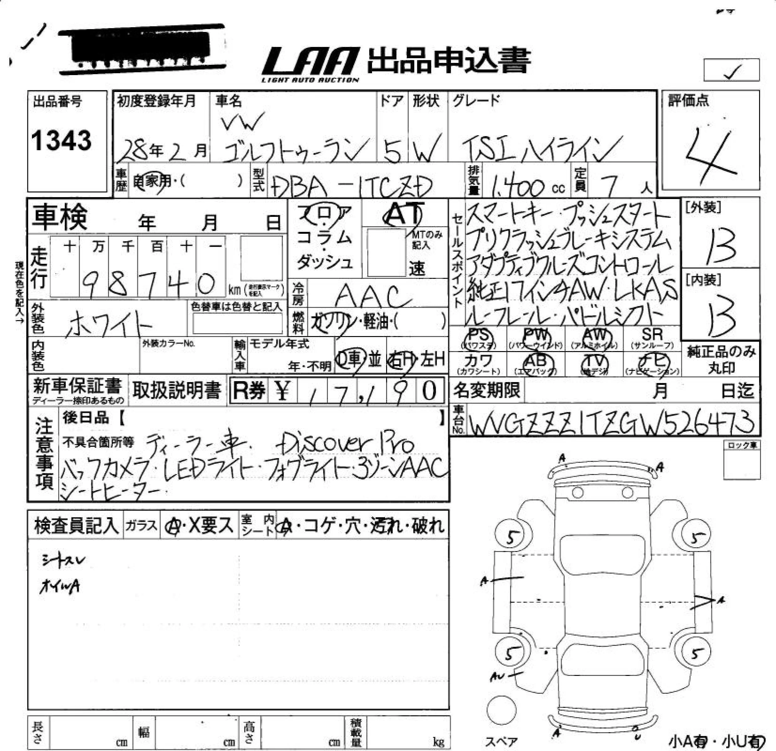Volkswagen GOLF TOURAN с аукциона Японии LAA Okayama лот № 1343