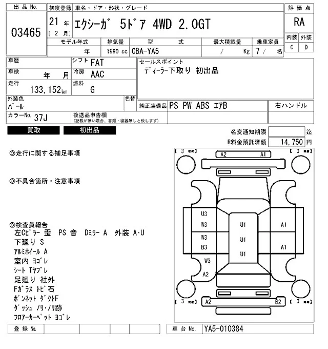 Subaru EXIGA с аукциона Японии ARAI Bayside лот № 3465