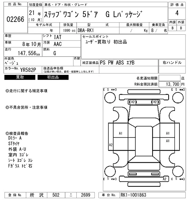 Honda STEP WAGON с аукциона Японии ARAI Bayside лот № 2266