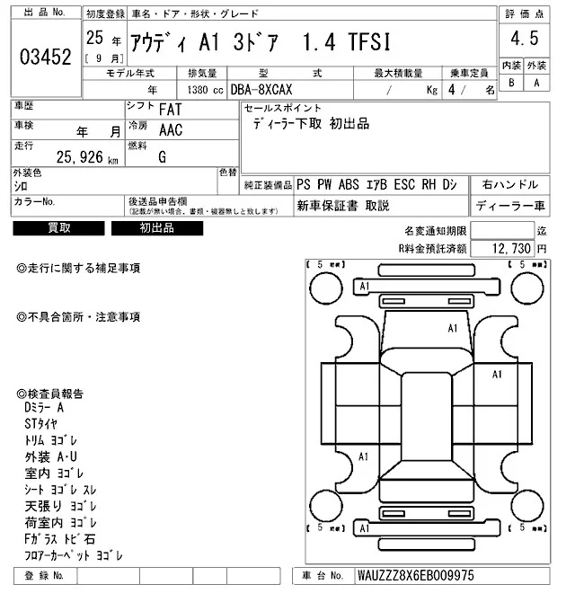 Audi A1 с аукциона Японии ARAI Bayside лот № 3452