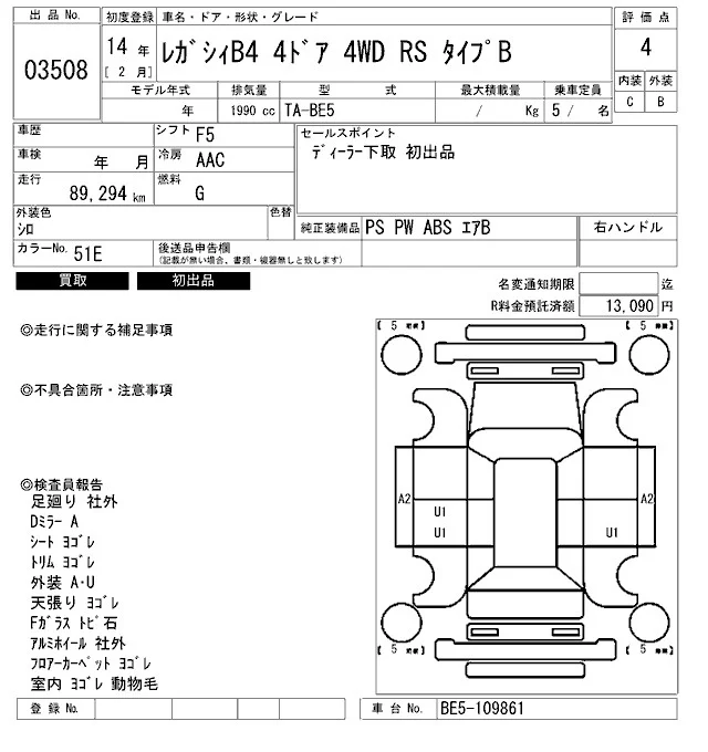 Subaru LEGACY B4 с аукциона Японии ARAI Bayside лот № 3508