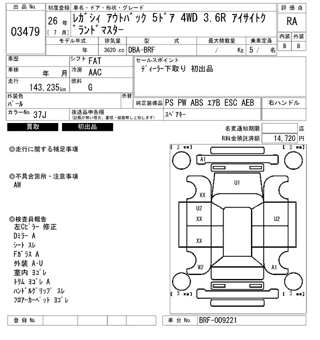 Subaru LEGACY OUTBACK с аукциона Японии ARAI Bayside лот № 3479