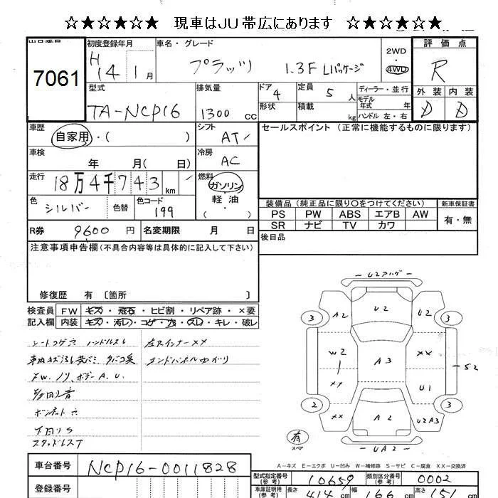 Toyota PLATZ с аукциона Японии JU Hokkaido лот № 7061