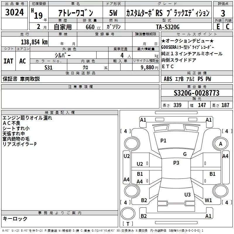 Daihatsu Atrai Wagon с аукциона Японии TAA Hyogo лот № 3024